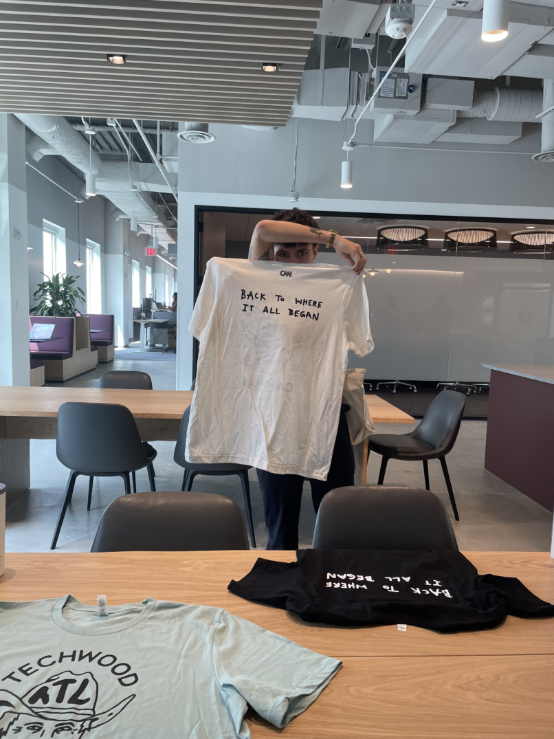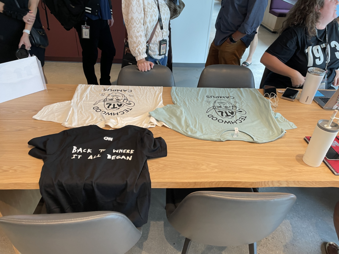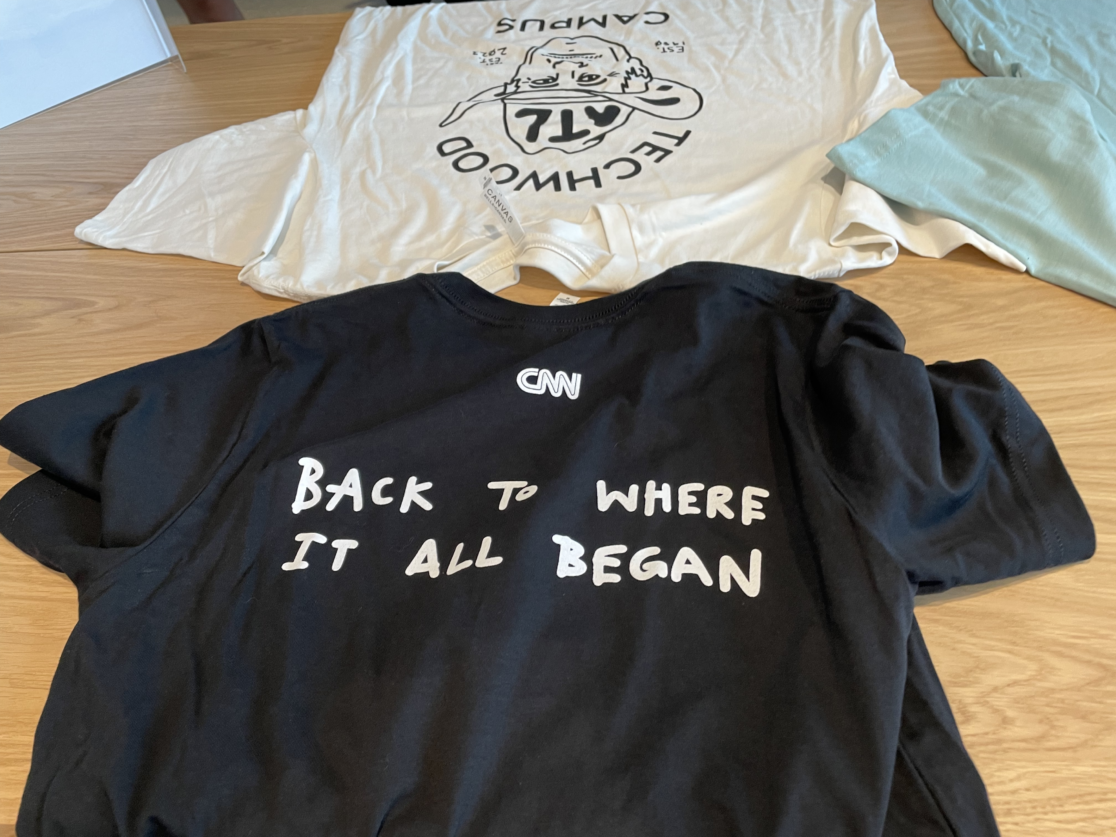 Created custom illustrations and designs for CNN employee shirts commemorating the company’s move back to its founding location at Techwood Campus in Atlanta, Georgia (2023). Includes a portrait of Ted Turner, used with permission.